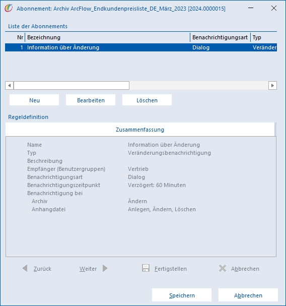 Mit Drücken der Schaltfläche [Fertigstellen] wird die Regel übernommen. Erst mit Verlassen des Dialoges durch Drücken der Schaltfläche [Speichern] wird das Abonnement in ArcFlow gespeichert.