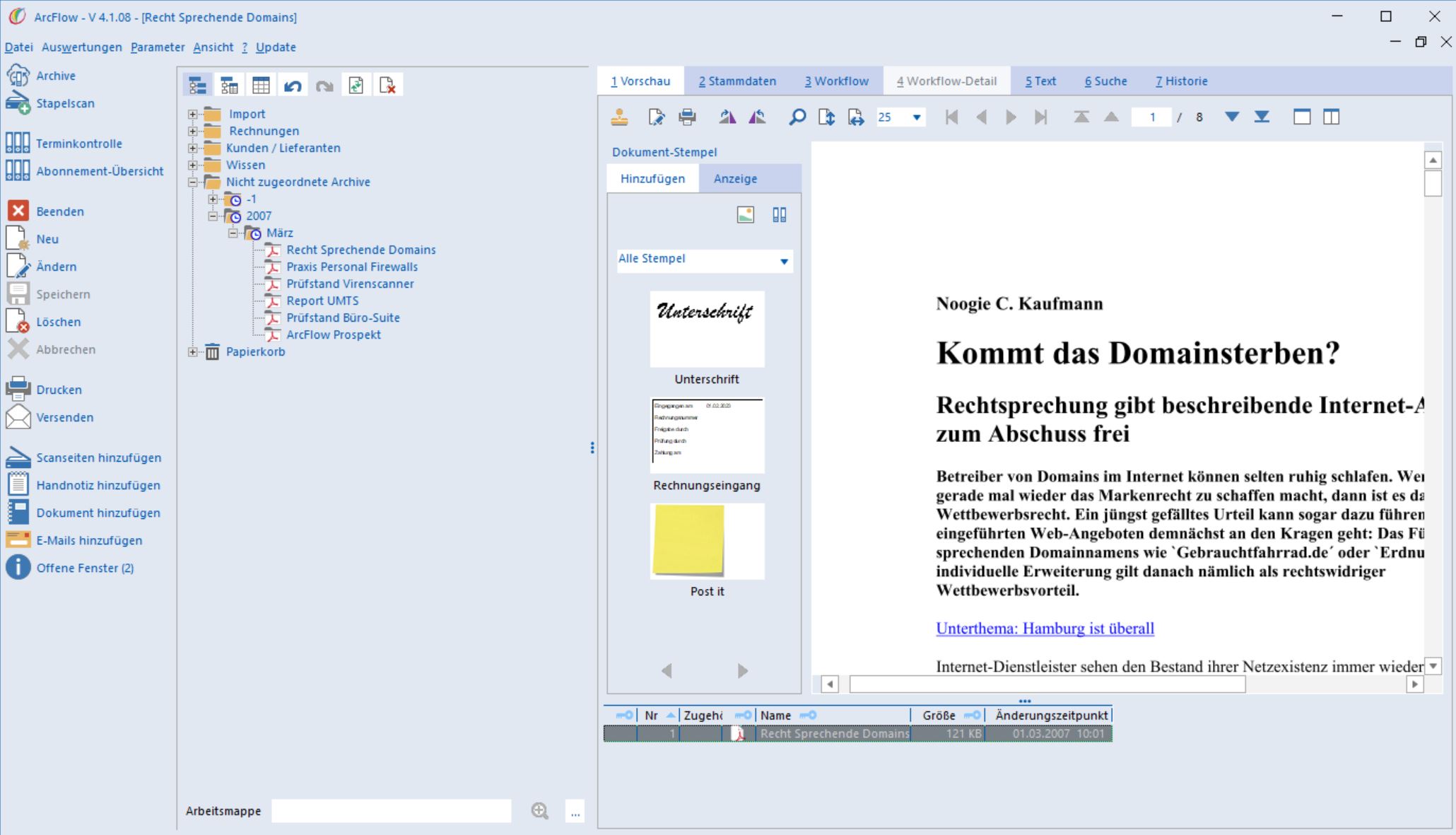Die Hintergrundfarbe des Fensters wird in Abhängigkeit vom Workflow verändert. Existiert zu einem Archiv ein Workflow, bekommt das Fenster einen gelben Rahmen. Ist dieser Workflow abgeschlossen, ist der Rahmen grün.