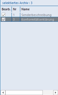 Wurde der Dialog mit [Speichern] verlassen, wird das Archiv in der Liste als Bearbeitet markiert. Ein Archiv wird immer dann als Bearbeitet markiert, wenn die Stammdaten gespeichert wurden oder die Bezeichnung in der Liste geändert wurde. Die Markierung kann ebenfalls mit einem Doppelklick in der Spalte gesetzt werden.