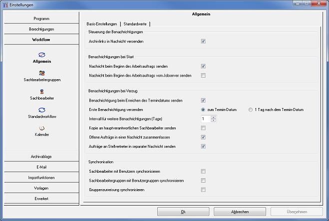 In dem Bereich "Standardwerte" können Vorgaben für die Neuanlage von Workflow-Details angegeben werden.