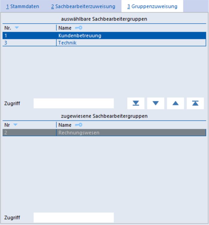 Sachbearbeiter können einer oder mehreren Sachbearbeitergruppen zugeordnet werden. In der oberen Liste werden alle Sachbearbeitergruppen angezeigt, zu denen der ausgewählte Sachbearbeiter nicht gehört. In der unteren Liste werden alle Sachbearbeitergruppen aufgeführt, in denen der Sachbearbeiter bereits Mitglied ist. Die Gruppen können über die entsprechenden Schaltflächen hinzugefügt oder entfernt werden. Über das Feld "Zugriff" kann in den entsprechenden Listen direkt positioniert werden.